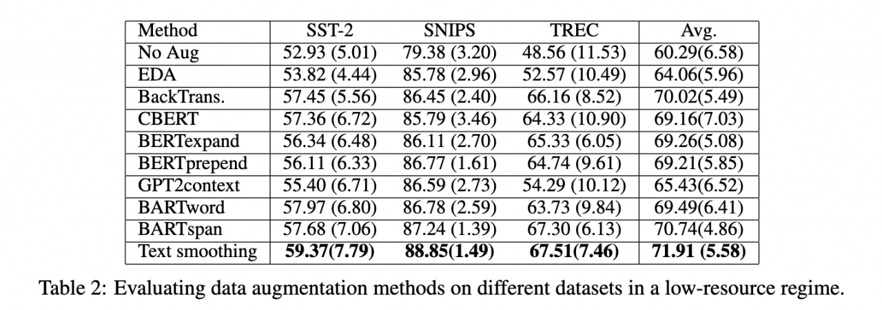 作者在SST-2、SNIPS、TREC数据上,对不同的数据增广方式做了对比,如下: