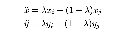 是通过两个样本再合成一个样本达到数据的增广。如上公式所示: 样本( x i , y i ) , ( x j , y j ) (x_i, y_i), (x_j, y_j)(xi,yi),(xj,yj),对x i 和 x j x_i和x_jxi和xj的输入在embedding处加权和,得到新的输入embedding,标签是y i 和 y j y_i和y_jyi和yj直接进行加权和。然后用新的embedding去学习合成的标签。这里的λ \lambdaλ取值范围[0,1]之间。