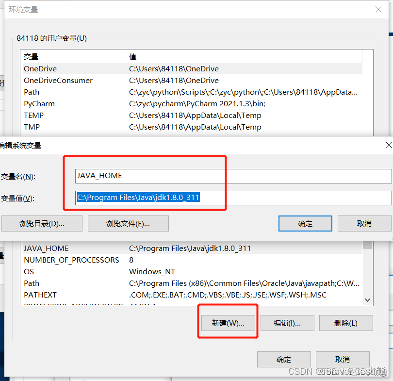 5.点击新建,输入变量名JAVA_HOME,变量值为JDK的bin目录所在路径,就是刚刚复制的路径,注意不要有bin,复制路径至jdk文件夹即可
