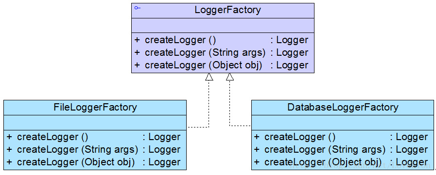 Sunny公司开发人员通过进一步分析,发现可以通过多种方式来初始化日志记录器,例如可以为各种日志记录器提供默认实现;还可以为数据库日志记录器提供数据库连接字符串,为文件日志记录器提供文件路径;也可以将参数封装在一个Object类型的对象中,通过Object对象将配置参数传入工厂类。此时,可以提供一组重载的工厂方法,以不同的方式对产品对象进行创建。当然,对于同一个具体工厂而言,无论使用哪个工厂方法,创建的产品类型均要相同。如图4所示: