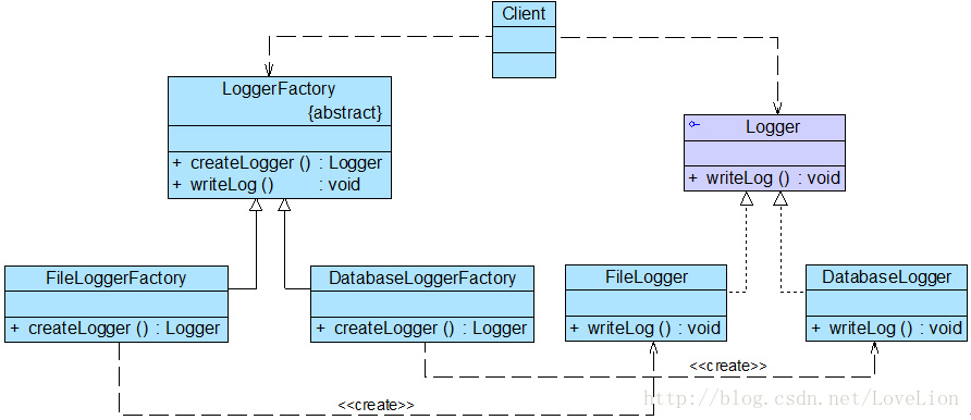 如果对客户端隐藏工厂方法,日志记录器的结构图将修改为图5所示: