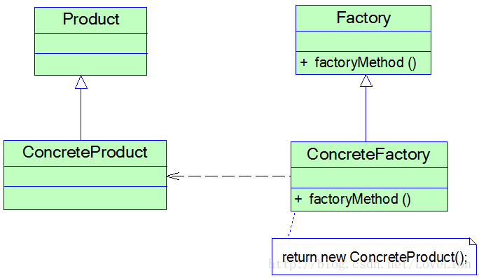 (1) 在工厂方法模式中,工厂方法用来创建客户所需要的产品,同时还向客户隐藏了哪种具体产品类将被实例化这一细节,用户只需要关心所需产品对应的工厂,无须关心创建细节,甚至无须知道具体产品类的类名。