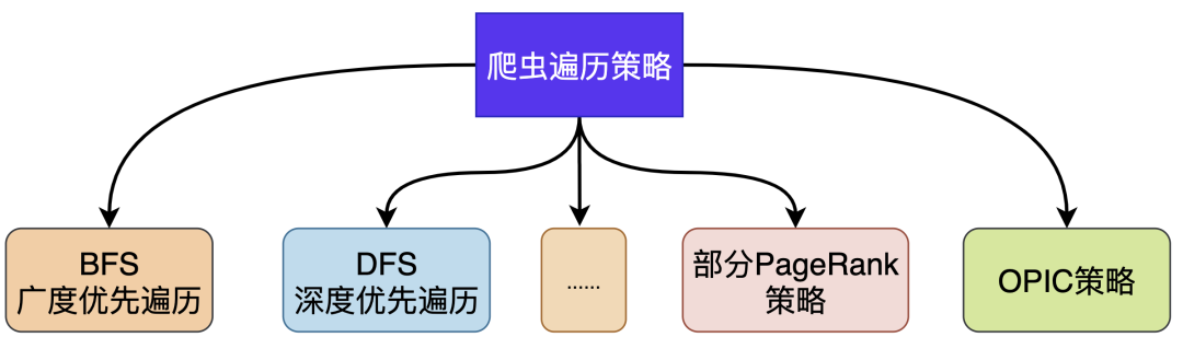 在抓取过程中会有多种遍历策略:深度优先遍历DFS、广度优先遍历BFS、部分PageRank策略、OPIC在线页面重要性计算策略、大站优先策略等。