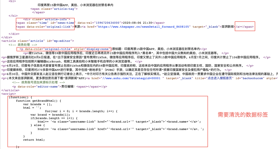 内容处理模块会将无用数据、标签清洗掉,为后续的分词做准备。