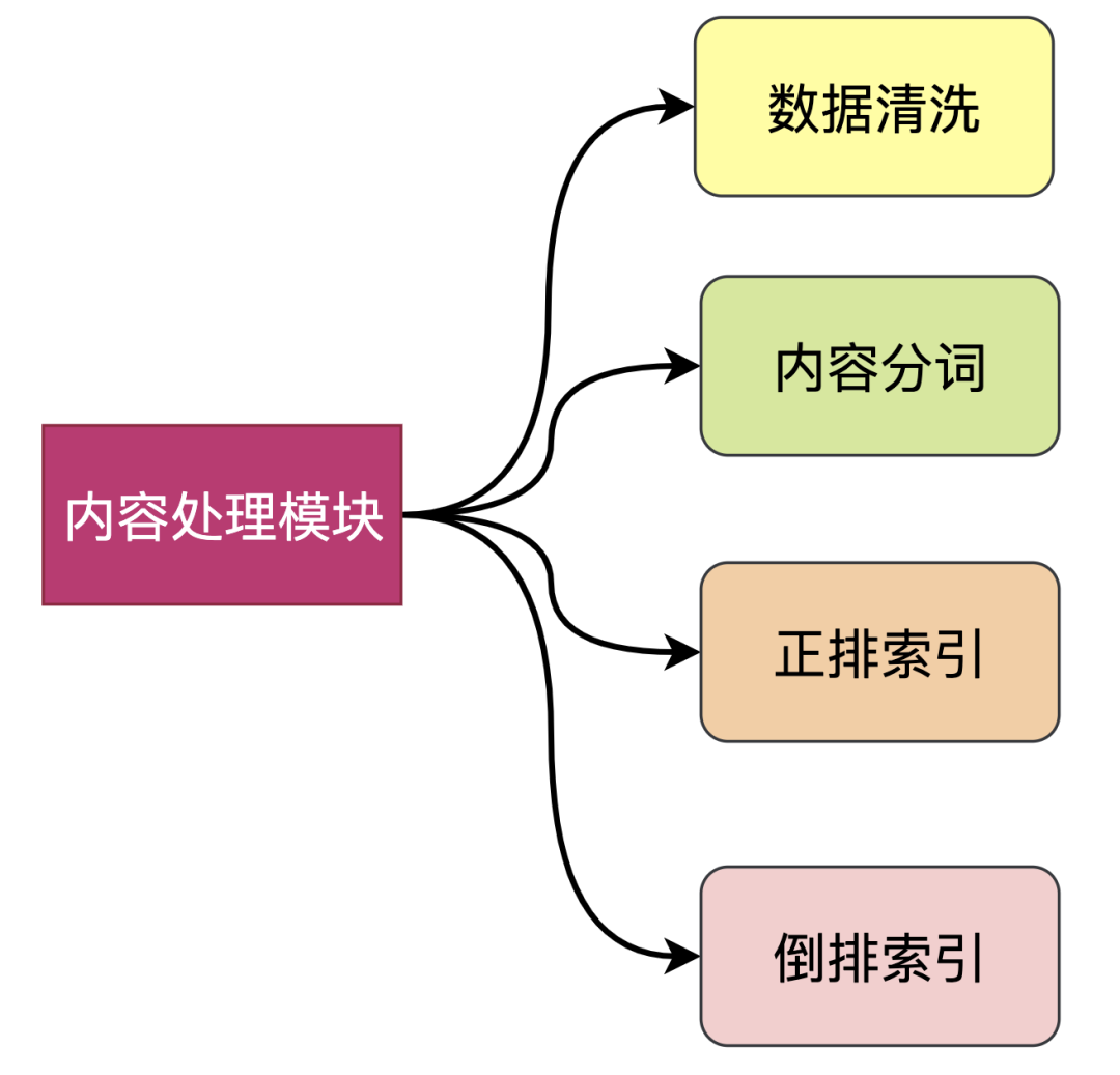 内容处理模块将抓取到的网页进行清洗、提前新URL给爬虫模块、内容分词、建立正排索引和倒排索引,是个承上启下的中间环节。
