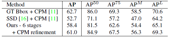 我们的方法的准确率低于对较小尺度($AP^M$)的个体的自顶向下方法。其原因是我们的方法需要处理在所有个体在一张图片的一个对焦中的更大的范围尺度。相反,自顶向下方法能够将每一个检测区域放缩到一个更大的尺寸因此相比小尺度受到更少的影响。
