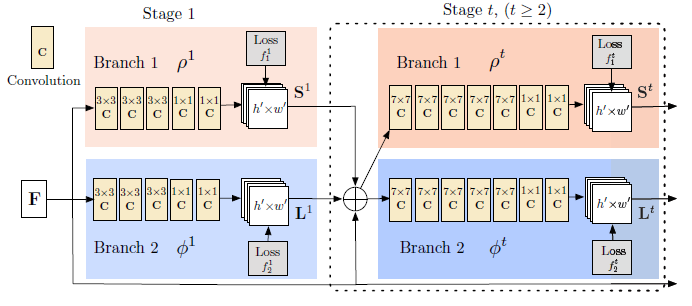 原图经过VGG-19得到F(feature maps),然后经过上下分支,每个分支有t个阶段(表示越来越精细),每个阶段将feature maps进行融合。