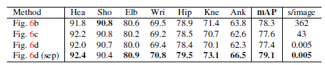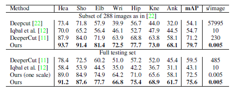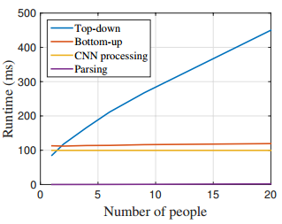 自底向上方法的运行时间几乎不随个体数量的增加而增加。运行时间主要包括两个部分:(1)CNN处理时间,其运行复杂度为$O(1)$而不管什么数量的个体;(2)多个体解析时间的运行复杂度为$O(n^2)$,其中n表示个体数量。然而,解析时间并不会很是影响整体时间,因为它比CNN处理时间小了两个数量级,例如,对于9个个体,解析用了0.58ms而CNN用了99.6ms。我们的方法对于有19个个体的视频达到了8.8fps的速度。