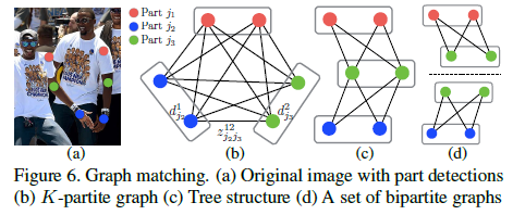 考虑一对关键点$j_1$和$j_2$(如脖子、右臂)组成的肢体$c$,可以抽象层二分图问题,其中节点为候选集合,边的权重由上面积分公式计算,二分图匹配选择最大权重的边,使得没有共享结点。