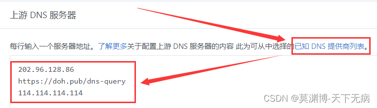 这里的空白处填写,可以在 已知DNS提供商列表 里面找到,然后填写上去,或者根据自己的地区和网络运营商进行填写,这个填写内容的作用是:这台DNS服务器没有的域名就会向这些填写的的服务器上查找相关的域名解析