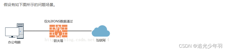 办公电脑通过防火墙与互联网相连,防火墙被配置为仅允许DNS数据通过。在此场景下,办公电脑显然无法直接访问互联网。现在我们想做的是通过使用dns2tcp建立DNS隧道,使得办公电脑可以访问互联网。