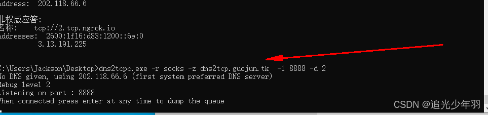 dns2tcpc.exe -r ssh -z dns2tcp.guojun.tk -l 8888 -d 2