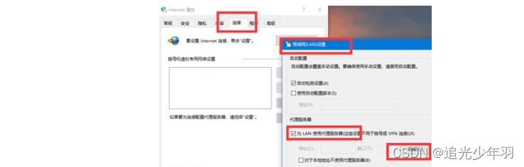打开Internet属性,依次选择 连接–局域网(LAN)设置–为LAN使用代理服务器–高级