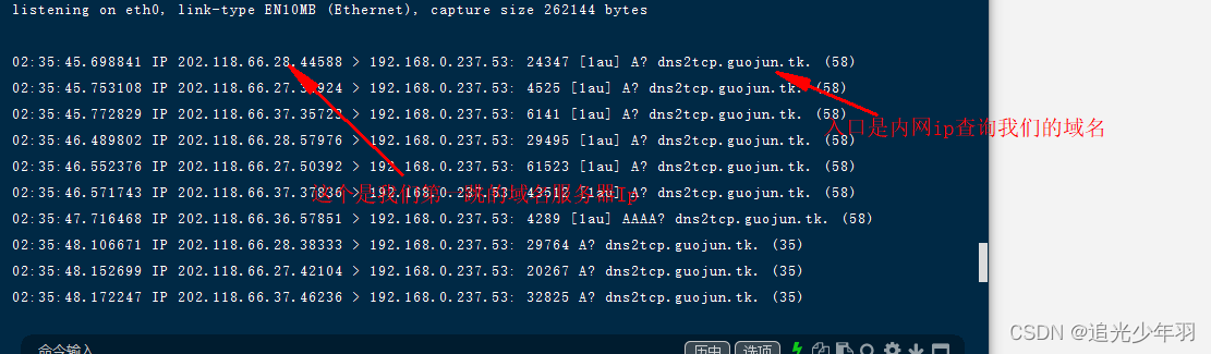 查看我们自己的云服务器上的抓包情况,若抓到对域名“dns2tcp.guojun.tk”进行查询的DNS请求数据包,则说明第二条NS解析设置成功并已生效。