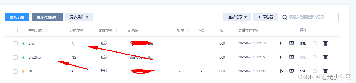 第一条A类解析是在告诉域名系统,dns.guojun.tk的具体ip地址