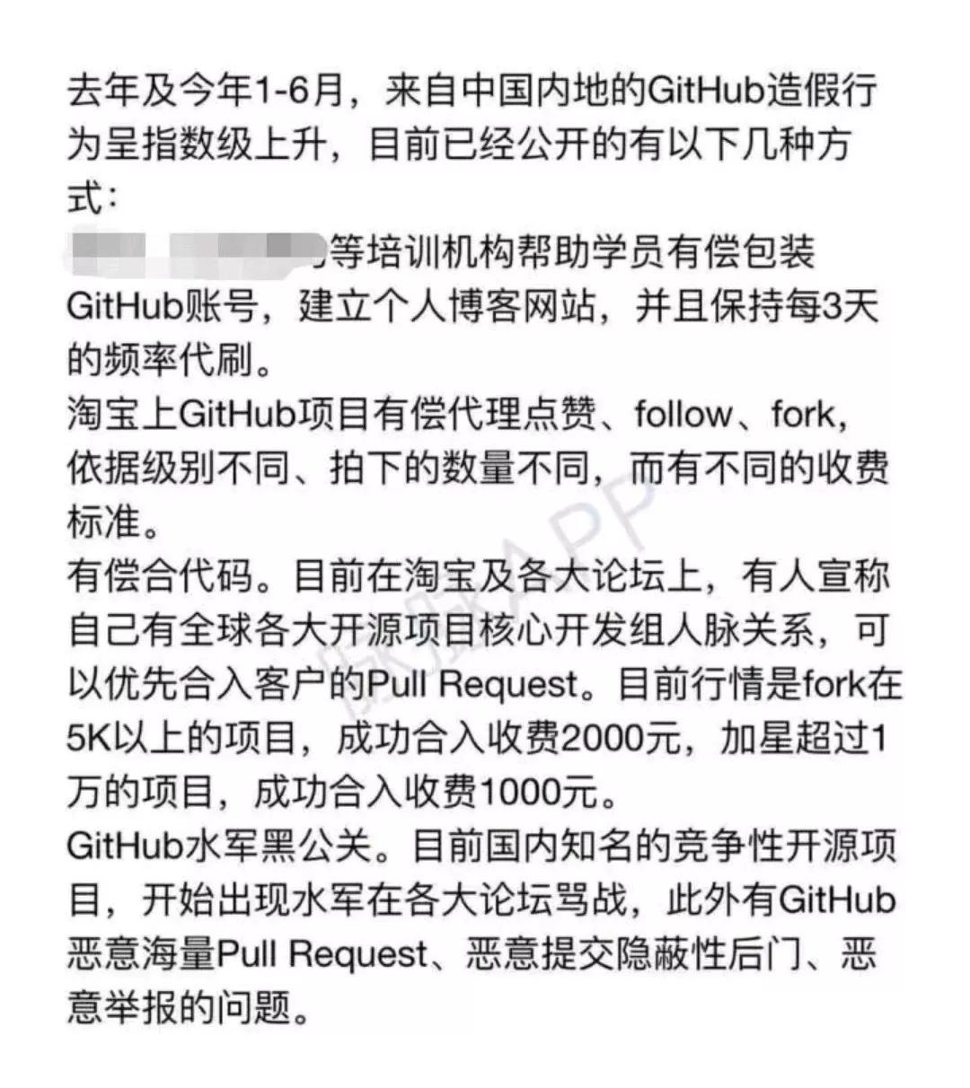 文中提到,国内的 Github 造假产业链已经非常成熟了,包括的方式有:培训机构统一包装 Github 账号、某宝有偿刷星等等。
