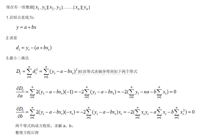 最小二乘法多项式直线拟合,就是根据给定的点,用计算的方法求出最佳的 a(斜率) 和 b(截距)。显然,关键是如何求出最佳的 a 和 b。
