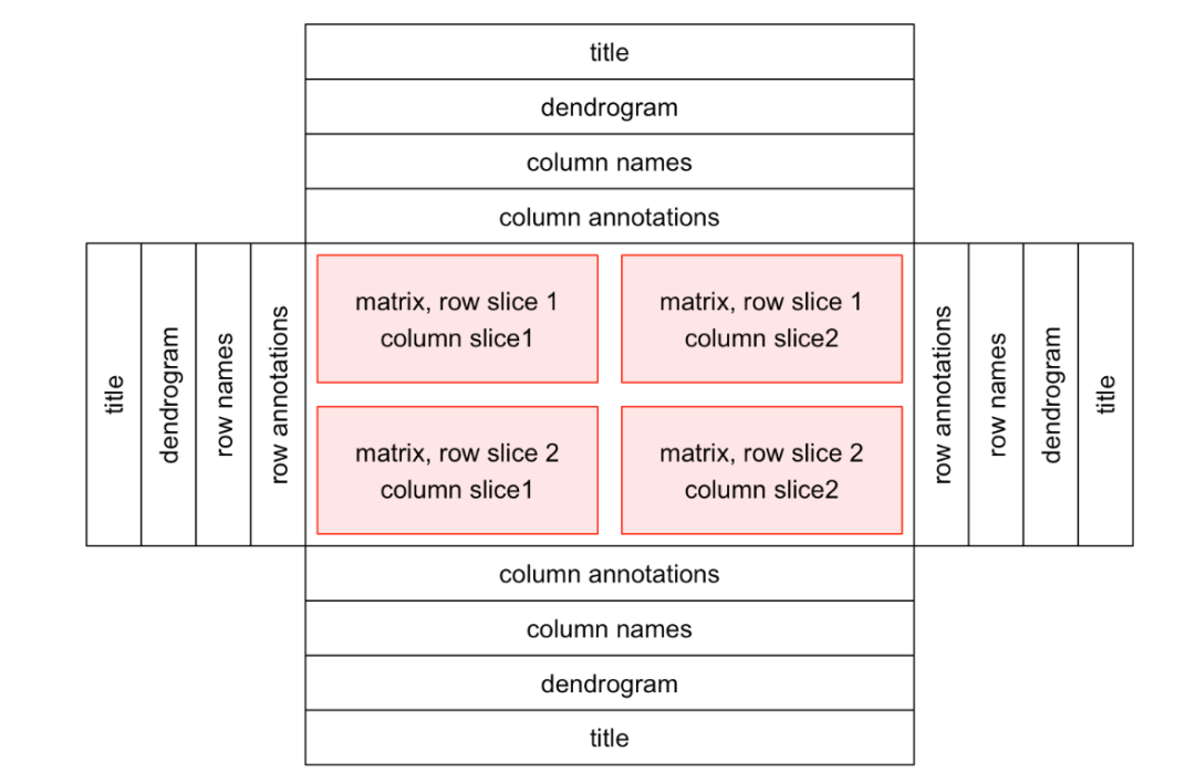 单个热图由热图体和热图组件组成。可以按行和列分割热图主体。热图组件包括标题、树状图、矩阵名称和热图注释,它们被放置在heatmap主体的四边。热图组件根据热图主体重新排序或拆分。
