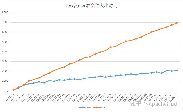 每十分钟读取两种表同一分区小文件大小,单位M。结果如下图,mor表文件大小增加较大,占用磁盘资源较多。不存在更新操作时,尽可能使用cow表。
