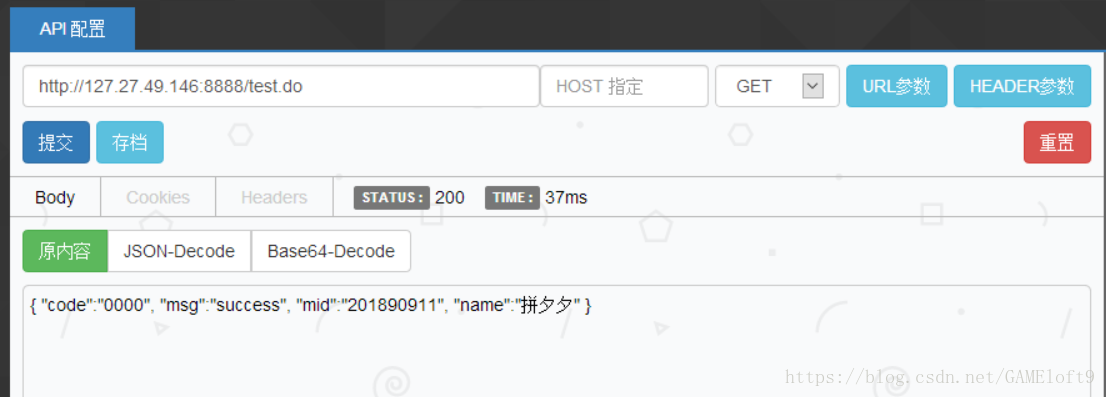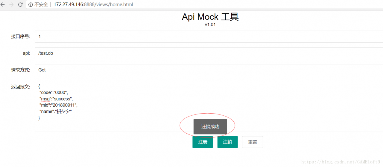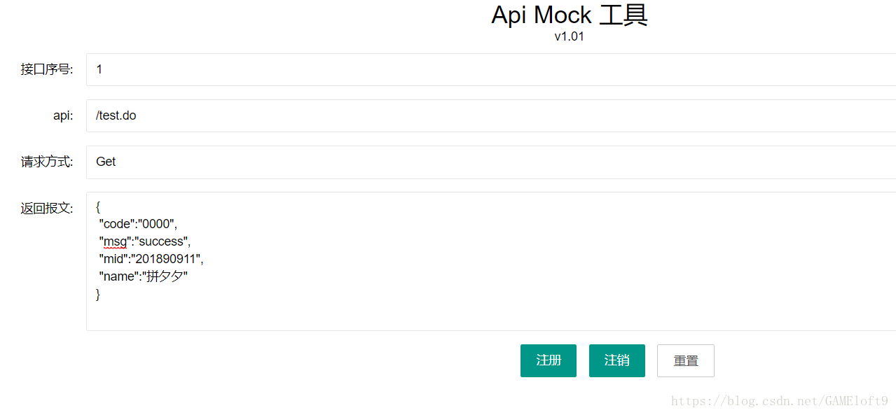 api-mock-util提供了10个可注册的接口,注册接口的时候选择要注册的接口序号。api是前端要请求的url,不带域名,例如:/test.do。请求方法支持get,post请求,应该可以覆盖大部分需求。返回报文由自己随意填写,后台会原样返回。一个典型的请求如下所示: