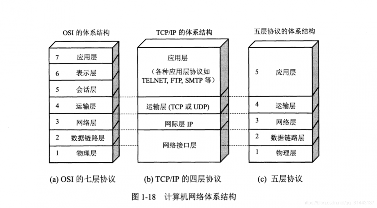 OSI的七层协议体系结构(图1-18(a)) 的概念清楚,理论也较完整,但它既复杂又不实用。TCP/IP 体系结构则不同,但它现在却得到了非常广泛的应用。TCP/IP 是一个四层的体系结构(图1-18(b)), 它包含应用层、运输层、网际层和网络接口层(用网际层这个名字是强调这一层是为了解决不同网络的互连问题)。不过从实质上讲,TCP/IP 只有最上面的三层,因为最下面的网络接口层并没有什么具体内容。因此在学习计算机网络的原理时往往采取折中的办法,即综合OSI和TCP/IP的优点,采用一种只有五层协议的体系结构(图1-18(c),这样既简洁又能将概念阐述清楚。有时为了方便,也可把最底下两层称为网络接口层。