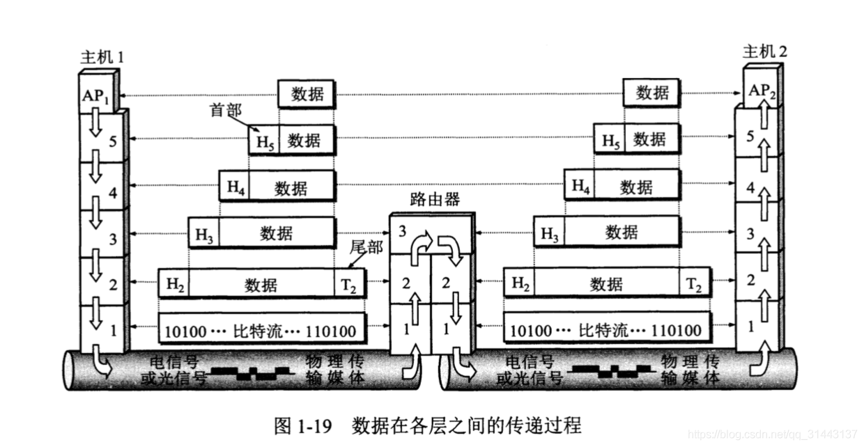 假定主机1的应用进程AP1向主机2的应用进程AP2传送数据。AP1 先将其数据交给本主机的第5层(应用层)。第5层加上必要的控制信息H5就变成了下一层的数据单元。第4层(运输层)收到这个数据单元后,加上本层的控制信息H4,再交给第3层(网络层),成为第3层的数据单元。依此类推。不过到了第2层(数据链路层)后,控制信息被分成两部分,分别加到本层数据单元的首部(H2)和尾部(T2);而第1层(物理层)由于是比特流的传送,所以不再加上控制信息。请注意,传送比特流时应从首部开始传送。