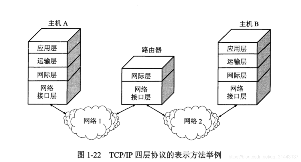 TCP/IP 的体系结构比较简单,它只有四层。图1-22 给出了用这种四层协议表示方法的例子。请注意,图中的路由器在转发分组时最高只用到网络层而没有使用运输层和应用层。