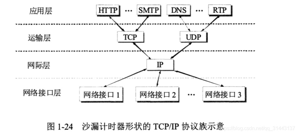 还有一种方法,就是分层次画出具体的协议来表示TCP/IP协议族(图1-24), 它的特点是上下两头大而中间小:应用层和网络接口层都有多种协议,而中间的IP层很小,上层的各种协议都向下汇聚到一个IP协议中。这种很像沙漏计时器形状的TCP/IP 协议族表明: