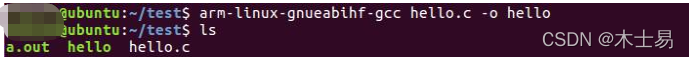 然后我们进到 test 目录下, 使用交叉编译器来编译下 hello.c , 编译方法和之前使用 gcc 编译方法是一样的, gcc 加 hello.c 这个源文件, 然后后边跟上-o 指定的文件名称, 格式是一摸一样的, 只不过把 gcc 编译器换成了交叉编译器, 使用 arm-linux-gnueabihf- 后边跟上 gcc 和要编译的原文件的名字,-o 指定下我们要生成的可执行文件, 这样就编译成功了, 如下图所示。