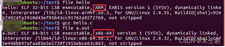 使用 file 命令来看下, 这里显示的架构是 arm , 说明这个可执行文件是在开发板上运行的而不是在 X86 上运行的, 可以看到, 使用 gcc 编译器编译出来的可执行文件, 它的架构是 X86 的, 所以使用 gcc编译器编译完的可执行程序只能在 X86 的 ubuntu 上运行, 不能在 arm 上运行。 大家通过 file 命令就可以区分了, 大家可以自己安装下。 如下图所示。