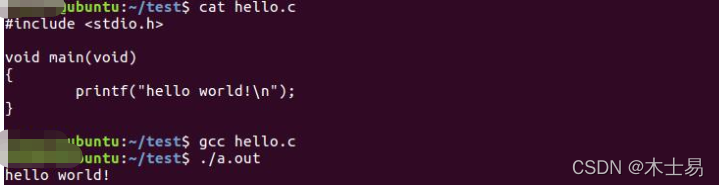 在 ubuntu 的 test 目录下有一个 hello.c , 这个程序也非常简单, 就是一个 hello world , 我们来编译一下, 然后运行下可执行文件, 这个可执行文件是可以在 PC上运行的。 如下图所示。