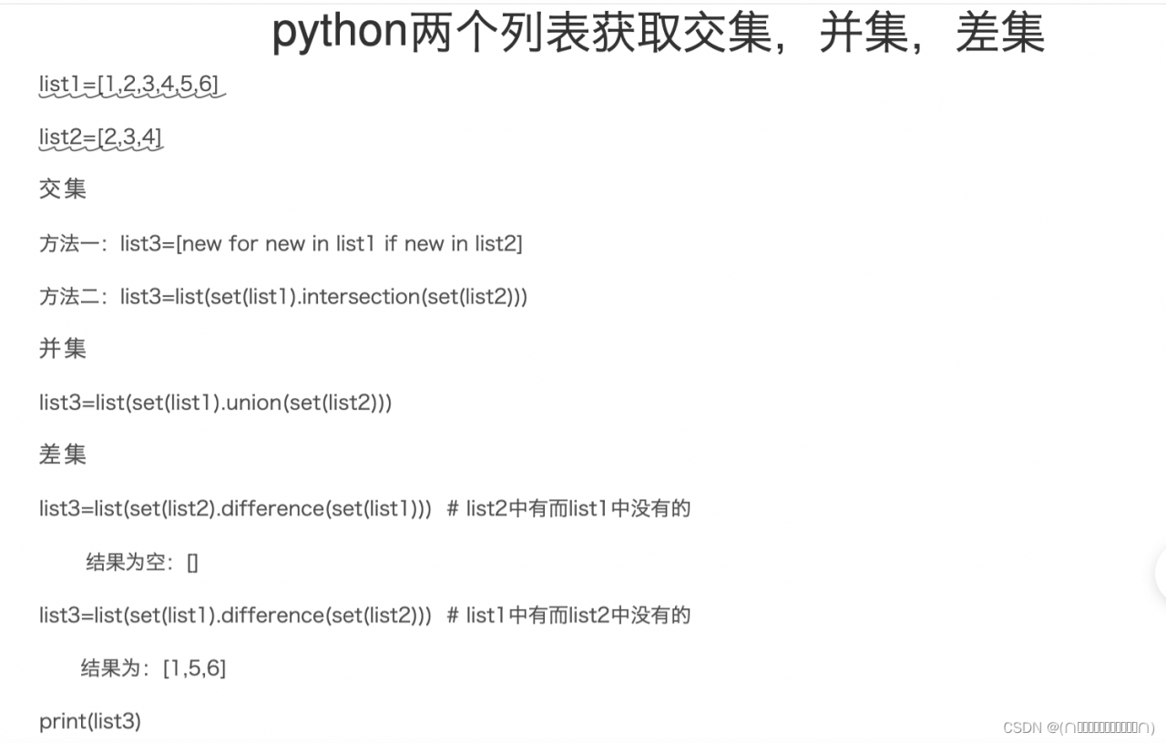 [python] 列表list的交集、并集、差集 版权声明:本文为Trance95原创文章,遵循CC 4.0 BY-SA版权协议,转载请附上原文出处链接和本声明。原文链接:https://blog.csdn.net/Trance95/article/details/126059171
