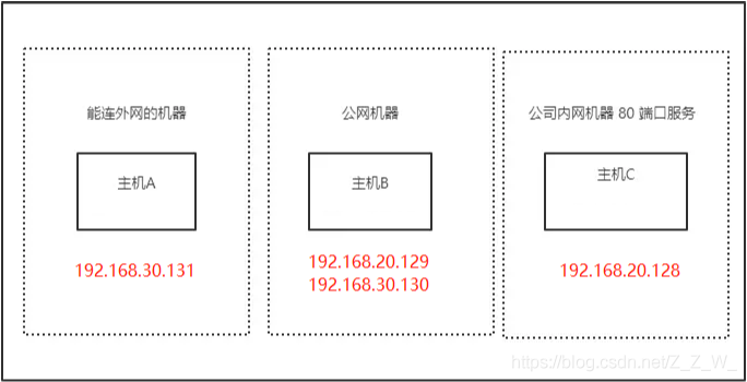 这是我在虚拟机模拟的环境,假设公司内网有B机器和C机器,B机器能上外网,C机器是内网的web服务器,不能上外网,只能在内网被访问。此时我在外网想使用A机器连接到B机器,那只能反向代理,把C的端口流量转发给B,再用A去访问B。