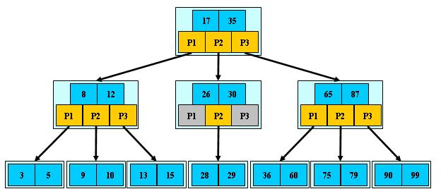 子树,P[M]指向关键字大于K[M-1]的子树,其它P[i]指向关键字属于(K[i-1], K[i])的子树;
