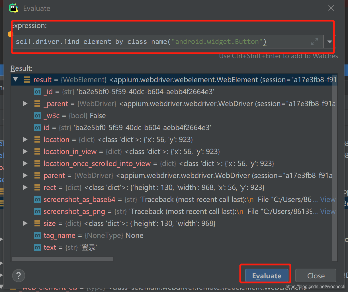 2.在断点处,可以利用pycharm的 Evaluate功能来定位弹出窗口的元素。
