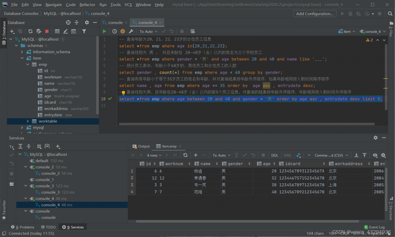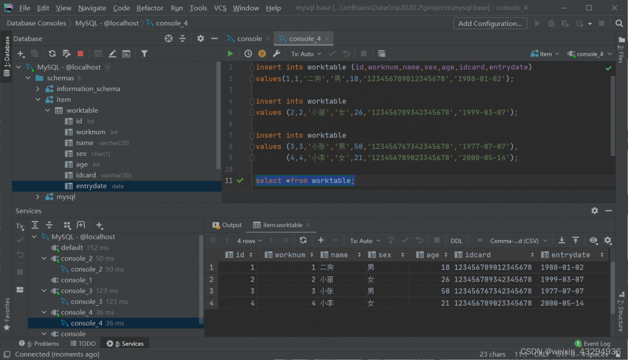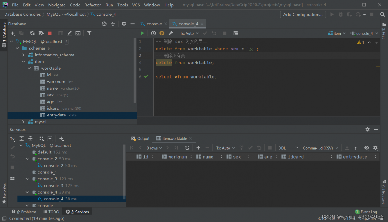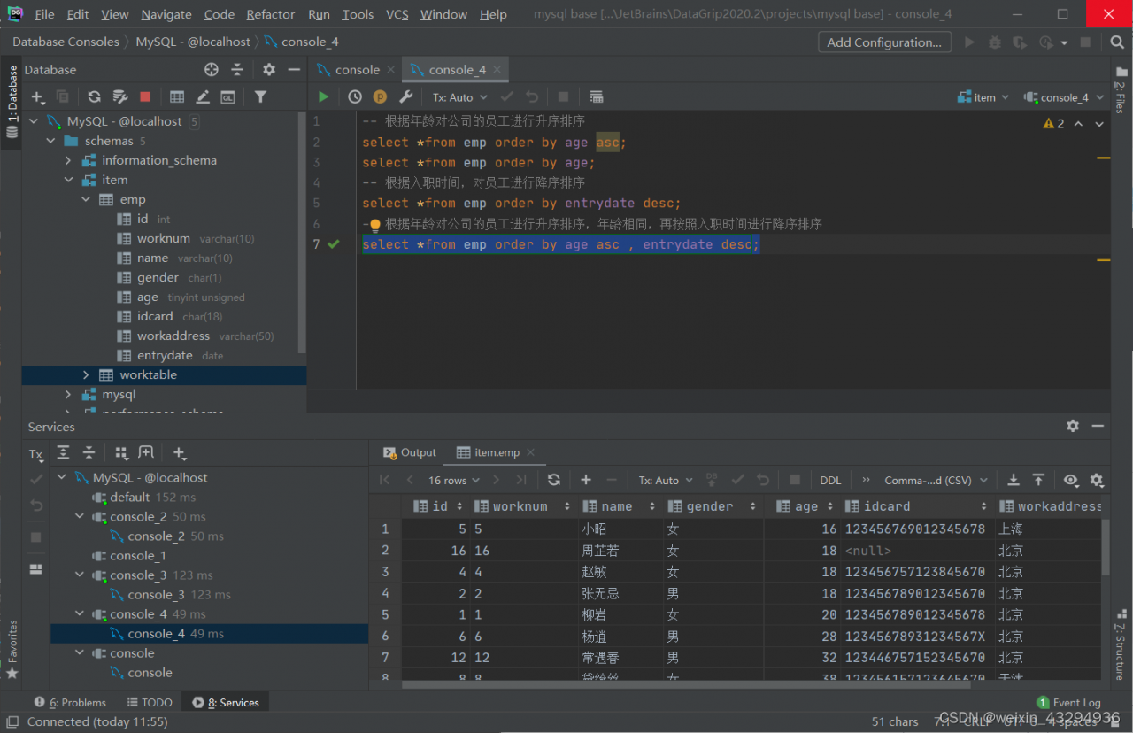 )comment '员工信息表';①添加数据