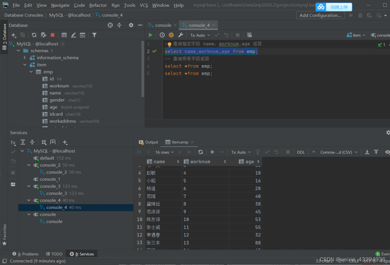 (16,'16','周芷若','女',18,null,'北京','2012-06-01');①基本查询