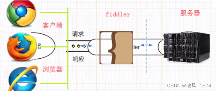 客户端的所有请求都要经过Fiddler,然后转发到相应的服务器,反之,服务器的所用响应都会先经过Fiddler,然后发送到客户端,它支持所有可以设置http代理(如:127.0.0.1:8888)的浏览器和应用程序。