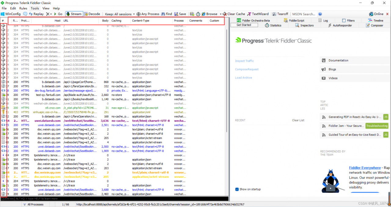 5. Fiddler 启动后,自动开始工作,此时打开浏览器,随便点击几个页面就可看到 Fiddler 抓取了许多网络包。