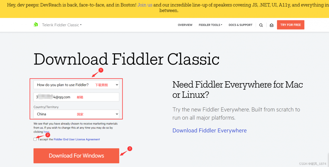 Fiddler 官网下载地址:点这里。(注意,这里下载的是 Windows 版本的,Mac、Linux 版本需要选择一下)