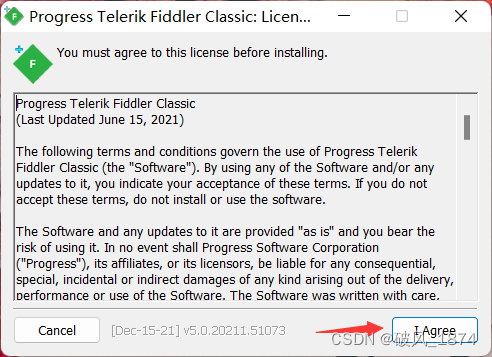 1. 首先,启动安装程序 FiddlerSetup.exe,点击同意
