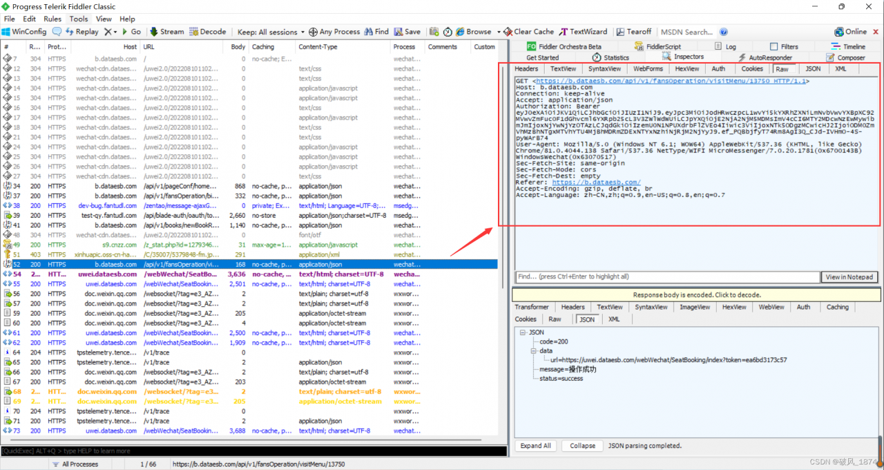 7、开始分析抓包数据,在左侧面板中,选择你想要查看到网页抓包信息,双击鼠标,右侧面板中可以查看具体信息,包括请求的 URL、请求头 headers、请求参数 params、密钥 token 和 cookie、发送的请求数据(Query Params),以及响应数据等等。