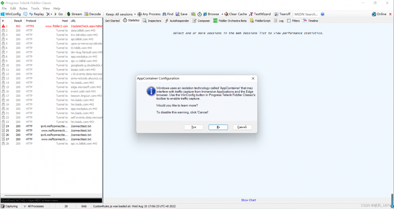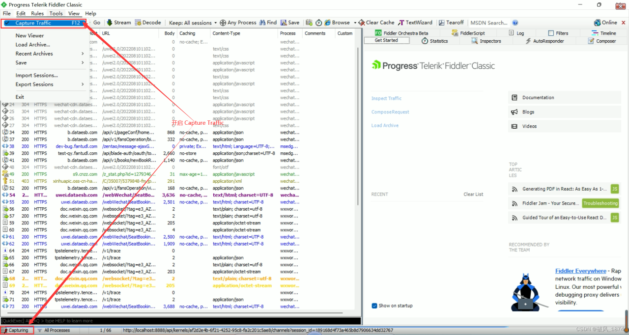 Fiddler 想要抓到数据包,要确保 Capture Traffic 是开启的,在 File –> Capture Traffic。开启后再左下角会有显示,当然也可以直接点击左下角的图标来 关闭 / 开启 抓包功能。