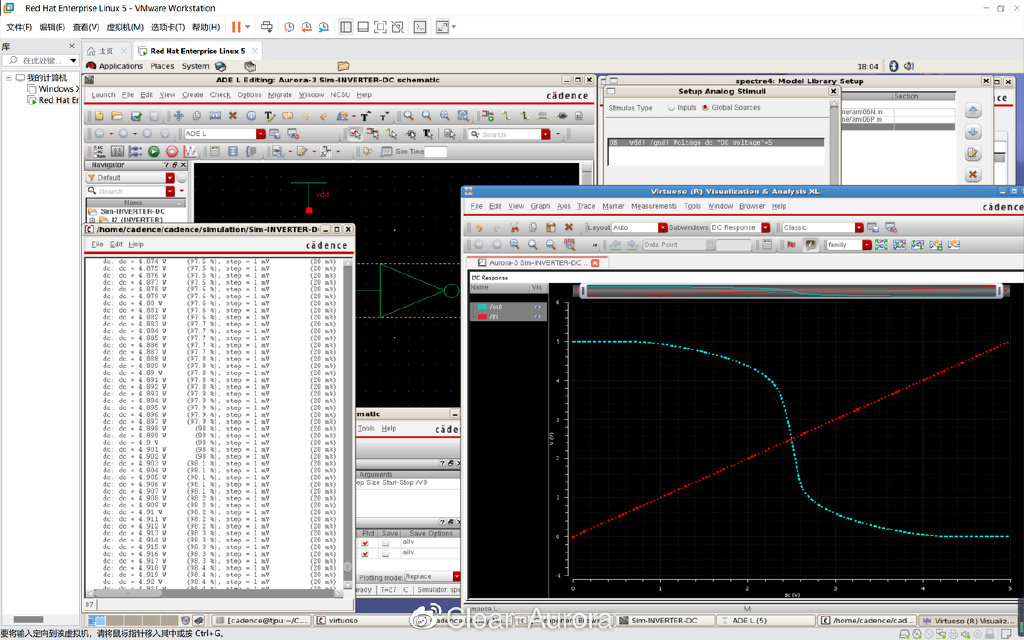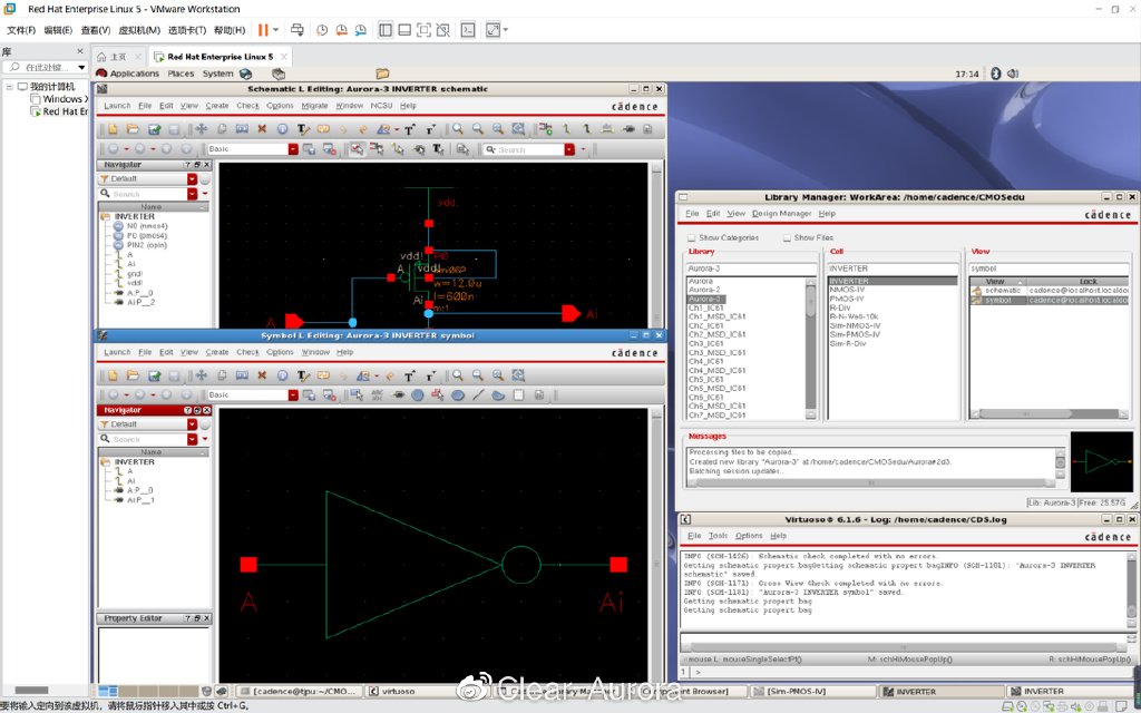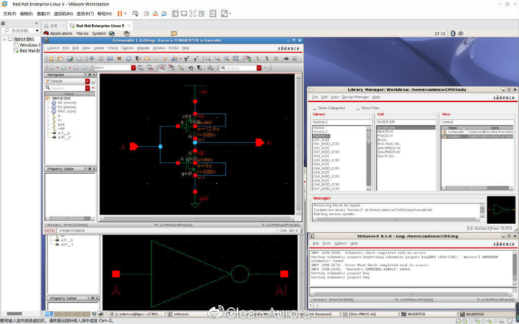 - 选择库管理器中的Aurora-3库,新建原理图,使用NCSU_Analog_Parts库中NMOS和PMOS元件和源网络绘制如下反相器原理图如图: