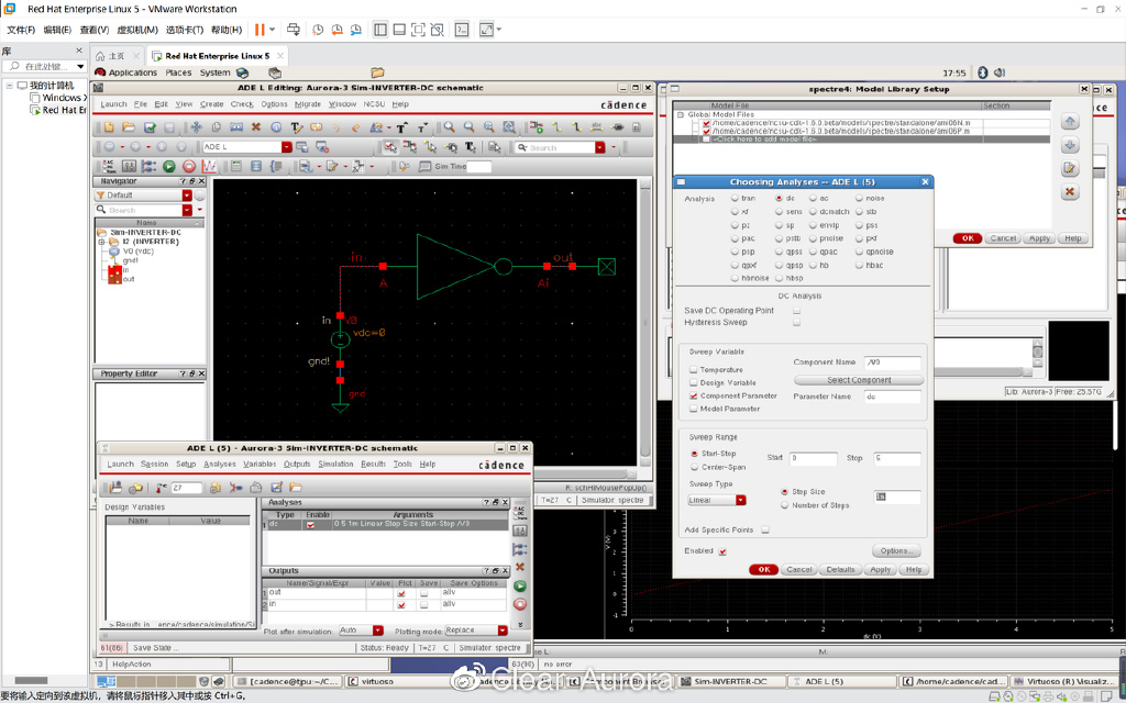 - 启动ADE_L,转至选择菜单Setup - > Model Libraries,选择地址在/$ HOME=/home/cademce/ncsu-cdk-1.6.0.beta/models/Spectre /standlone的ami06N.m(NMOS模型文件)以及ami06P.m(PMOS模型文件),并且设置Analyses -> Choose中直流参数,总体设置完后如下图: