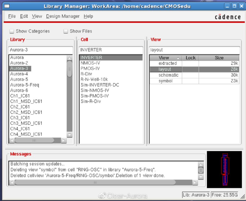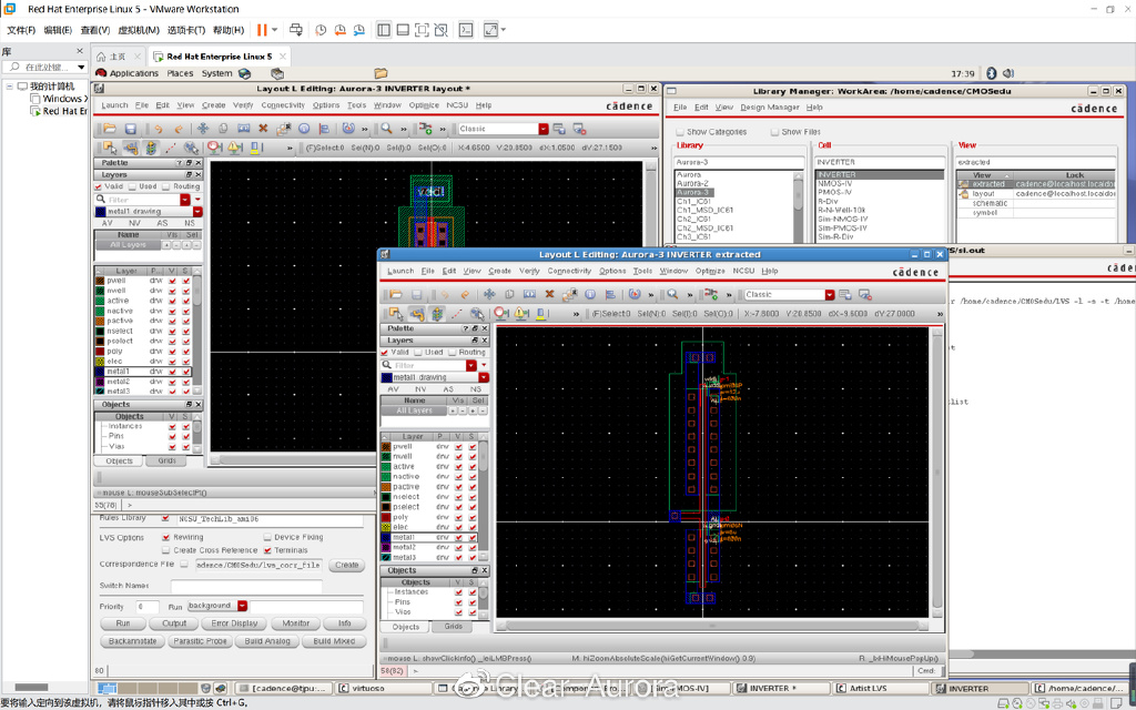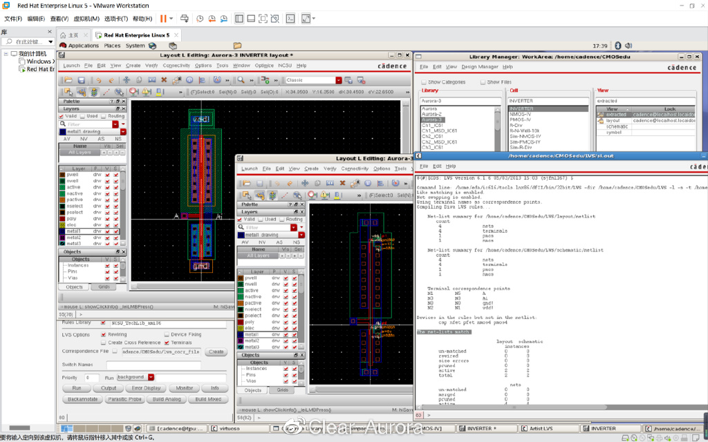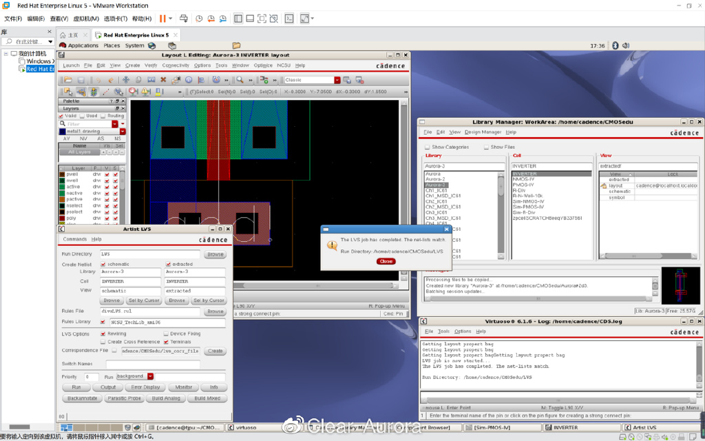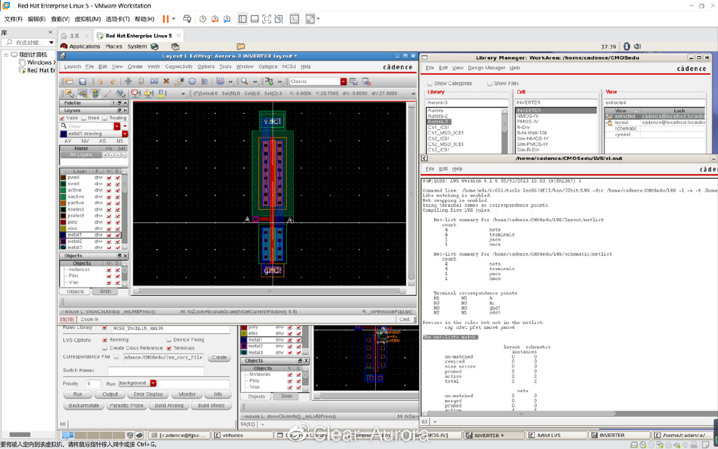 - 检查并使反相器版图的抽取视图(Extracted)与反相器的原理图相匹配,运行LVS,LVS完成后,结果如下: