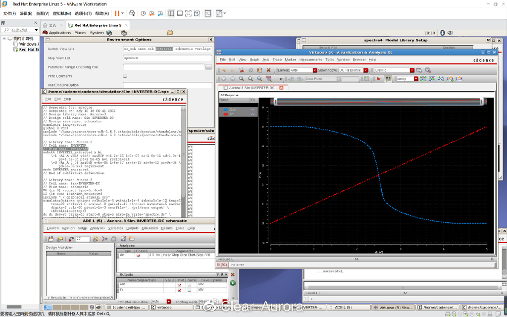 上图为实验最后设置反相器 Symbol原理图仿真环境Switch View List中仿真对象为“extracted schematic”后的仿真结果。