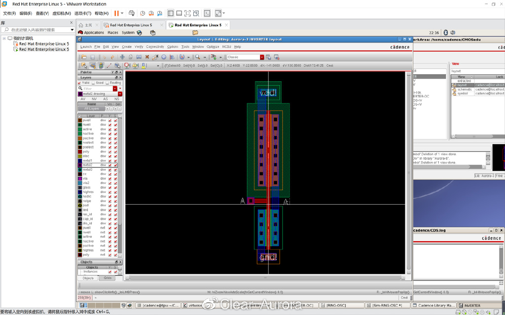 - 仿真结果符合预期,保存仿真文件于Cellview中便于下次调用无需重新设置参数,上述无问题后,进行版图绘制,在Aurora-3库中新建一个Layout版图文件,绘制反相器的版图,绘图布局时始终使用“drw”图层,绘制完成如下图所示: