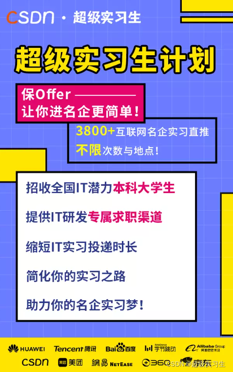 春招即将结束,还没有收到大厂offer的快快看过来!CSDN超级实习生计划2022年春季内推活动正在火热进行中,IT岗位众多,进不去大厂,拿不了名企offer,那就来超级实习生吧