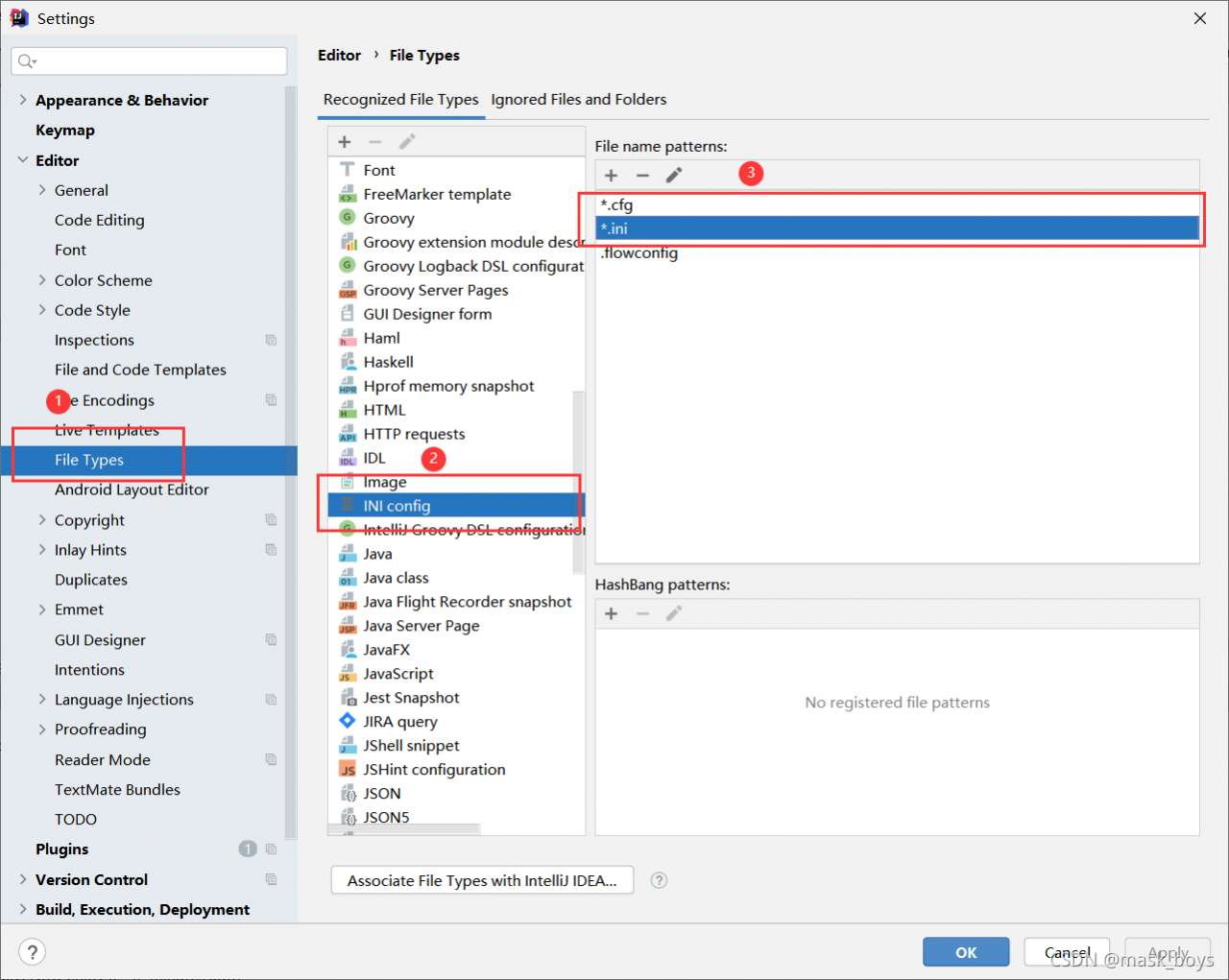 2.下载成功后,选择文件Settings——>Editor——>File Types找到INI config然后选择*.ini最后点击?就好了。